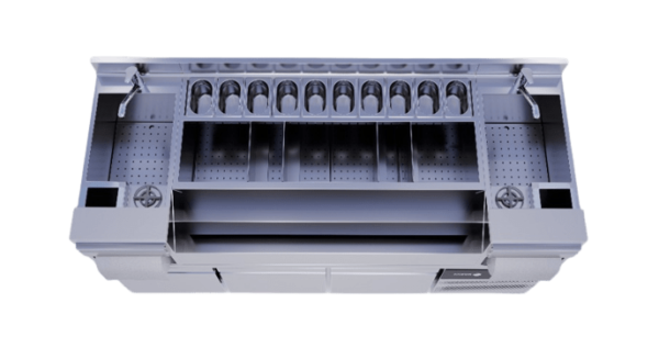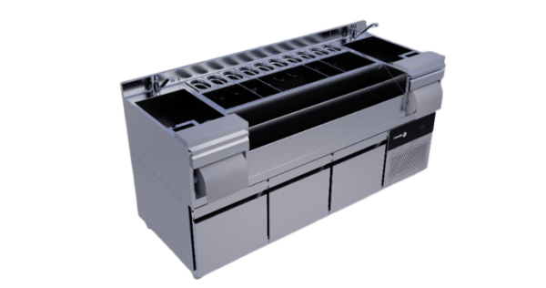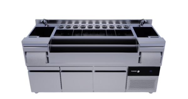 - Capacidad cuba aislada: 2 zonas para hielo, 1 zona para zumos y purés, 1 zona para 10 cubetas gastronorm 1/9 (cubetas no incluidas en el precio)