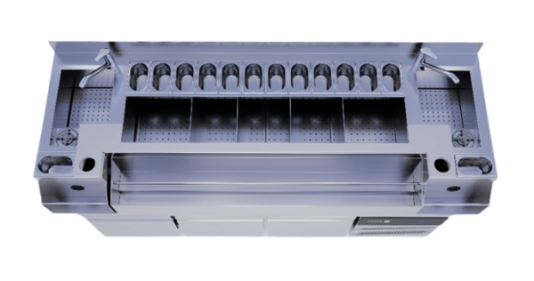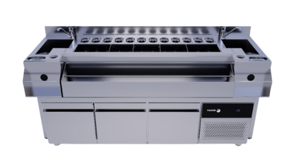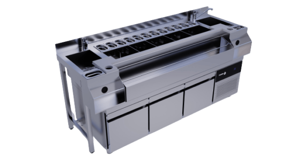 - Capacidad cuba aislada: 4 zonas para hielo, 1 zona para zumos y purés, 1 zona para 12 cubetas gastronorm 1/9 (cubetas no incluidas en el precio)
